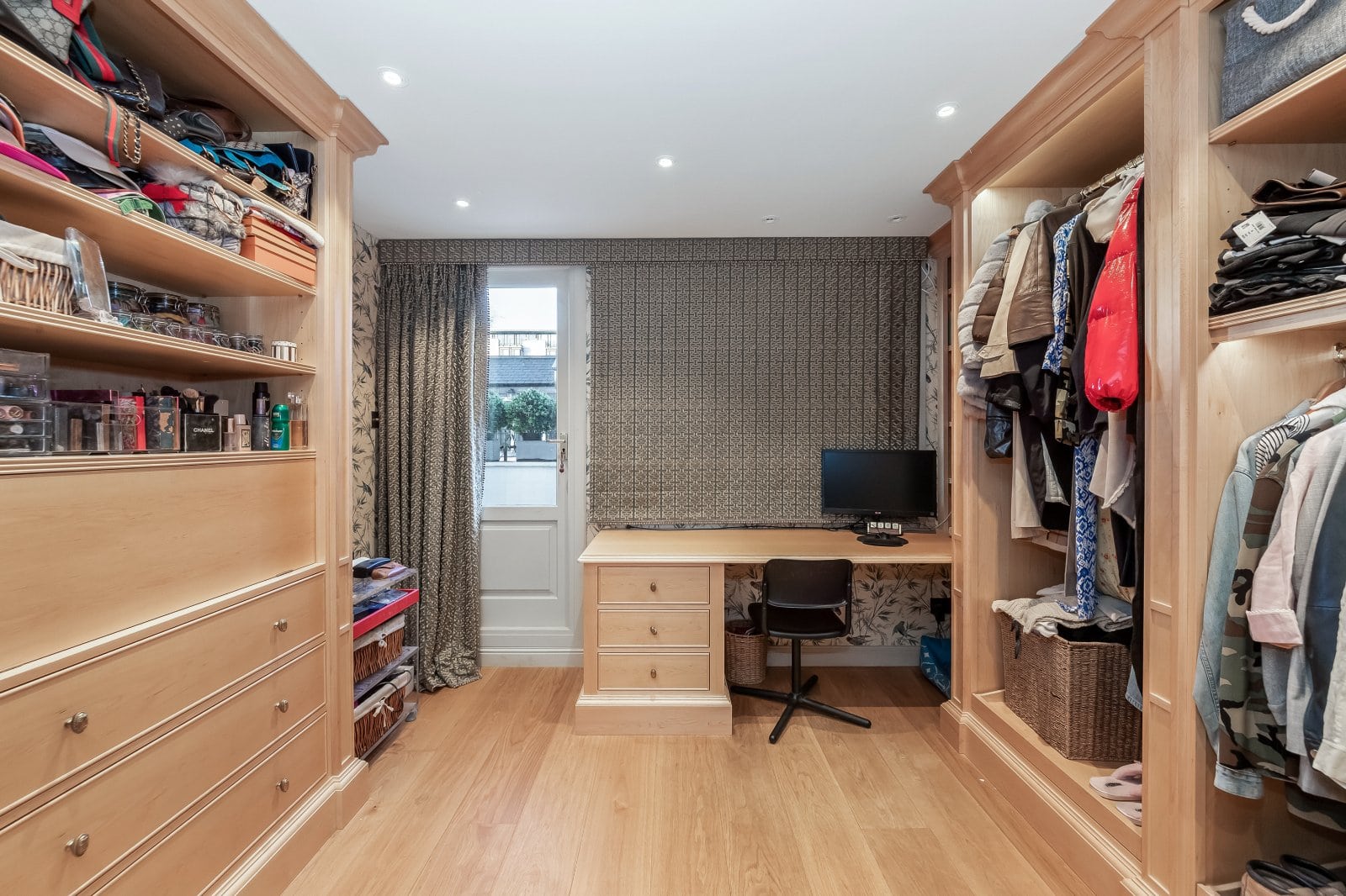 The property currently occupies the first and second floors of a characterful mews house, whilst the ground and basement offer opportunity for development. On the first floor, a generously proportioned open-plan living, kitchen, and dining area is complimented by rich wood panelling, creating a warm and inviting space. The upper floor features a spacious principal bedroom, complete with an adjacent study or dressing room, and a separate bathroom. From here, a private terrace offers fantastic views down the mews. The ground floor comprises two garages offering excellent scope for conversion into additional accommodation subject to planning. A concealed rear-facing window on the ground floor will provide further opportunity to transform the ground floor into a liveable space. The basement offers 3.5m-high ceilings, currently unfinished and offering significant development potential.