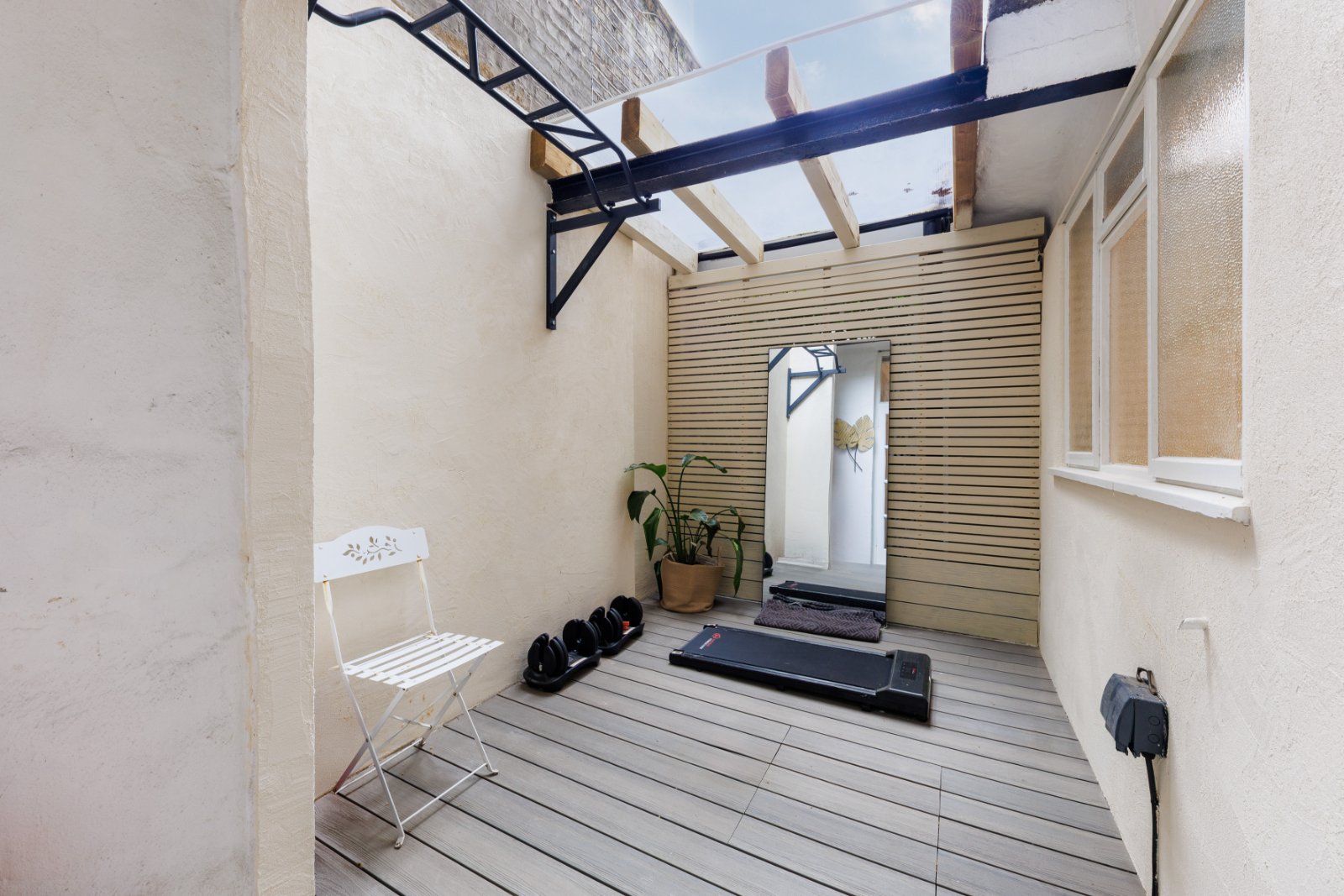 The beautiful reception room features stylish wall panelling, wood flooring and space for a both living and dining areas. The kitchen is fully fitted with integrated appliances and the property further benefits from a double bedroom with fitted storage, sleek bathroom and a private patio.