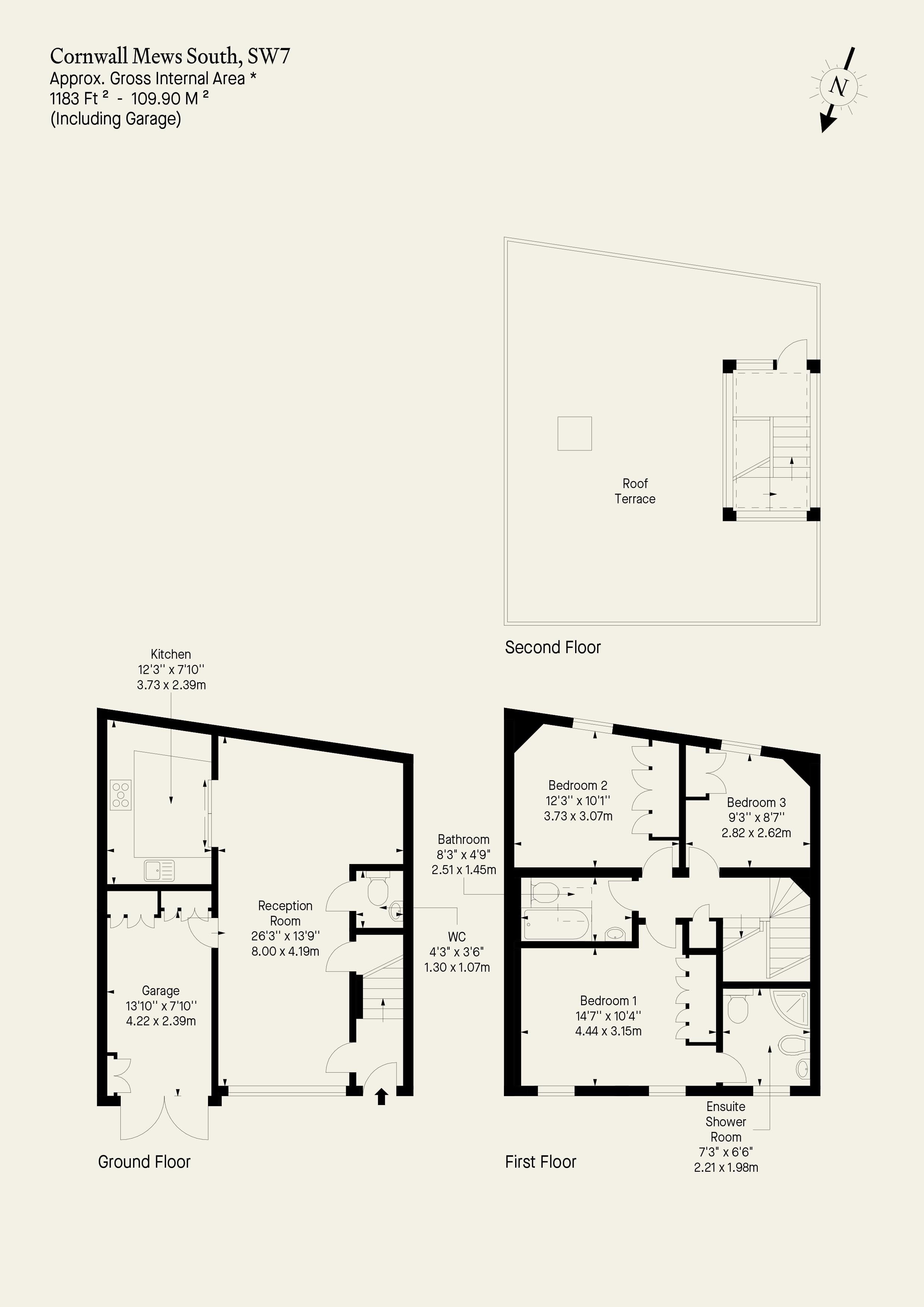 A beautifully presented three-bedroom house in a quiet mews. The property comprises a good size double reception room, fitted kitchen, WC and garage with washer/dryer. The first floor consists of three bedrooms with fitted storage, a family bathroom, and an en-suite bathroom to the master bedroom. The property has the added benefit of a roof terrace, perfect for summer evenings.